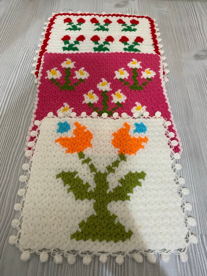 Çiçek desenli, yumuşak dokulu ve süslü kenarlara sahip renkli banyo süngerleri.