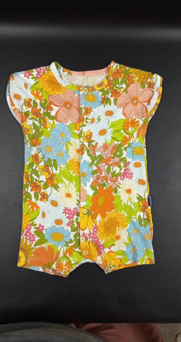 Çiçek desenli, çıtçıtlı renkli bebek kız şort tulumu. Yumuşak ve rahat kumaştan üretilmiştir.