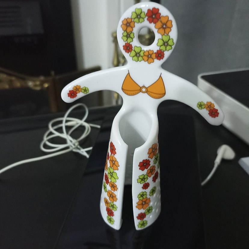 Çiçek desenleri ve bikini figürlü, pürüzsüz malzemeden yapılmış renkli biblo. Neşeli bir dekoratif üründür.