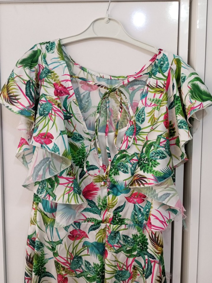 V yaka, fırfırlı ve bol kesim kadın tulumu. Sentetik kumaştan, kısa kollu ve renkli desenli, bohem tarzı için uygun.