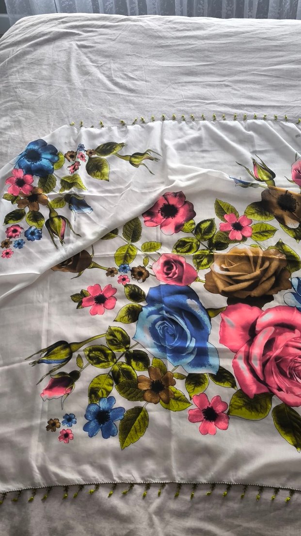 Yumuşak sentetik kumaştan, renkli çiçek desenli ve drapeli kadın şalı, bohem tarz için uygundur.
