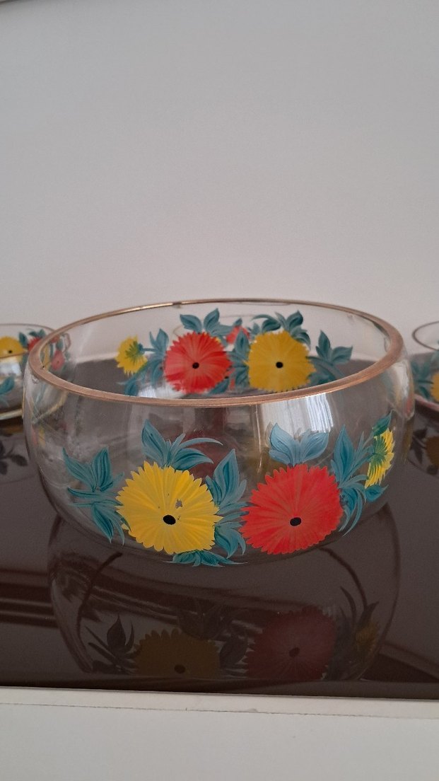 Kırmızı, sarı ve yeşil canlı çiçek desenleriyle süslenmiş islevsel ve dekoratif renkli cam kase. İnce altın rengi kenarlığı bulunur. orta buyuk kase 20 cm küçükler(6 adet) 11 cm çapında.Büyük kasede resimde görüleceği üzre altin renkli kenarda citlama var.
