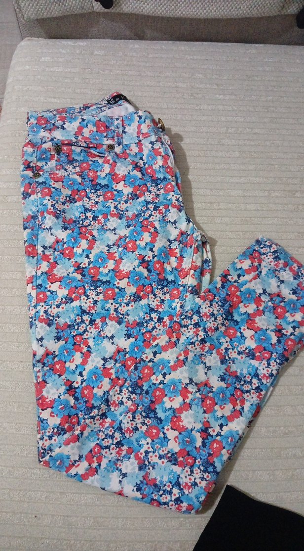 Renkli çiçek desenli, fermuarlı, normal boyda, dar kesim cocuk kumaş pantolon. Günlük kullanıma uygun, trend bir görünüm sunar.