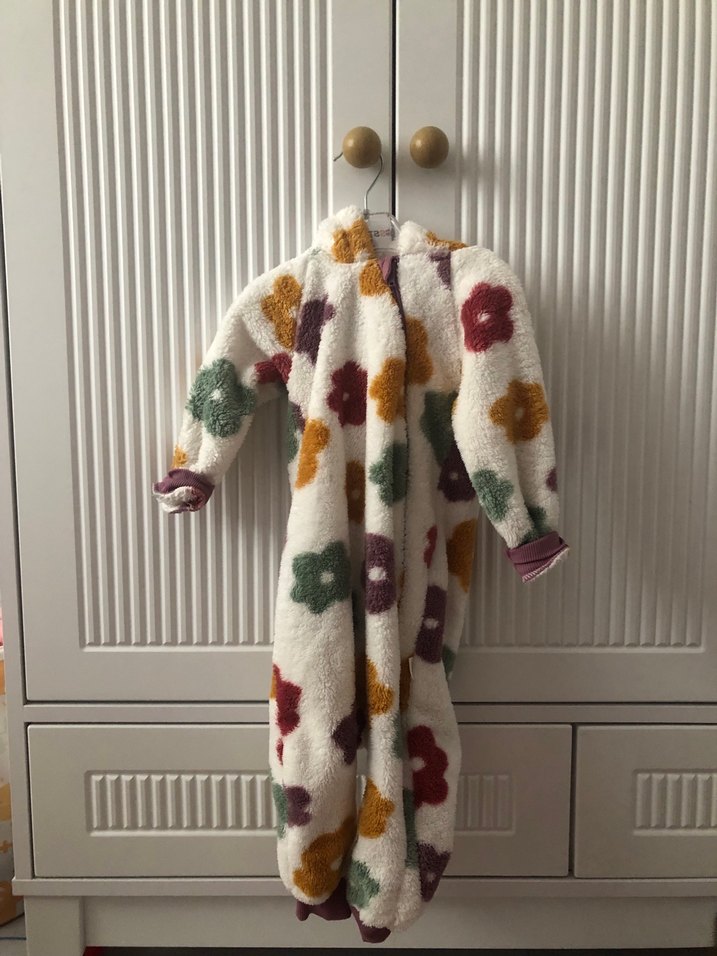 Yumuşak ve kabarık kumaştan, canlı çiçek desenli renkli çocuk tulumu. 12-18