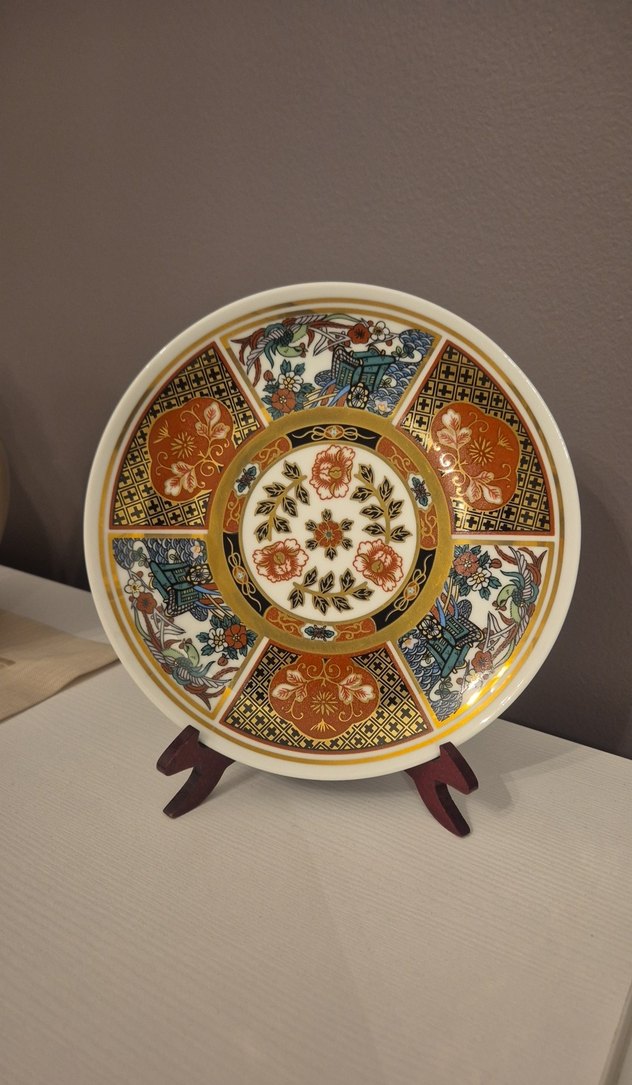 Çiçek desenli, koyu renkli ve çok renkli detaylara sahip, 20 cm çapında, antika japon tabak, ahşap ayaklığı mevcut.