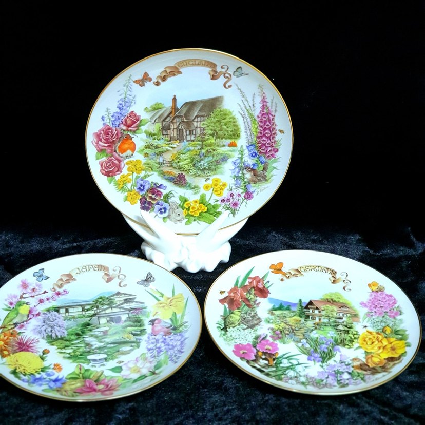 Ülkeler bahçeleri Almanya ,Japonya, ingiltere Renkli çiçek desenleri ve kırsal manzaralar içeren klasik tarzda dekoratif tabak seti. Her tabakta canlı renkler ve altın detaylar bulunur.