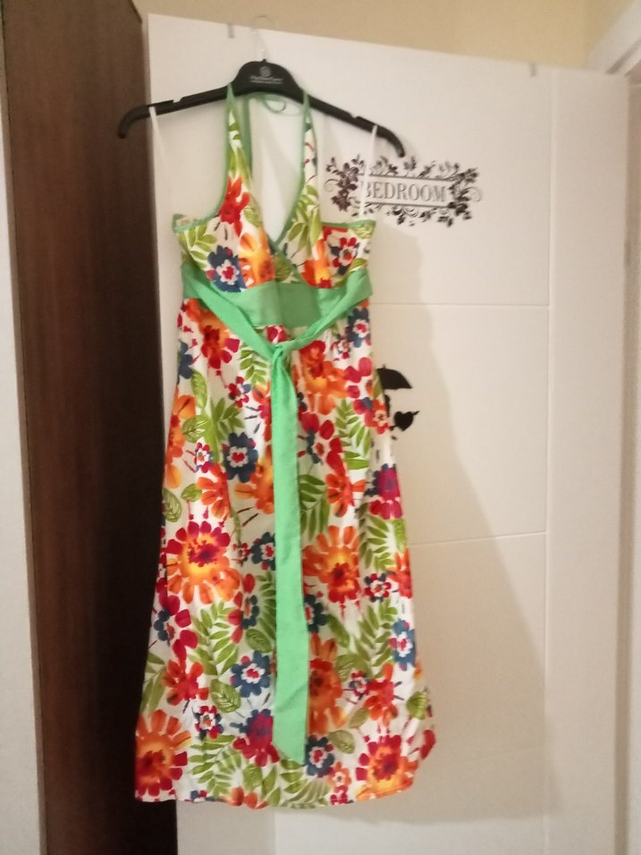 Canlı çiçek desenli, yeşil bel bağlamalı renkli elbise