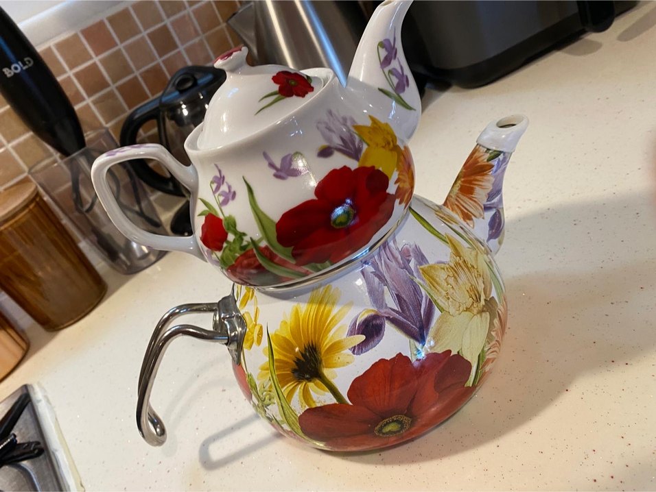 Renkli çiçek desenleriyle emaye demlik seti, küçük ve büyük boy olmak üzere iki parçadan oluşur.