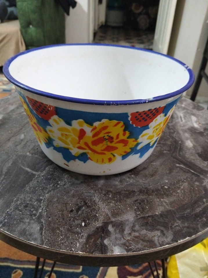 Beyaz zemin üzerine renkli çiçek desenleri ve mavi kenarlığı olan emaye kase, servis veya dekorasyon için uygun.