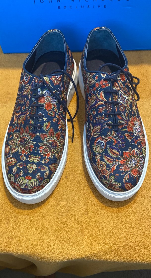 Renkli çiçek desenli tekstil malzemeden üretilmiş, bağcıklı erkek günlük ayakkabısıdır.