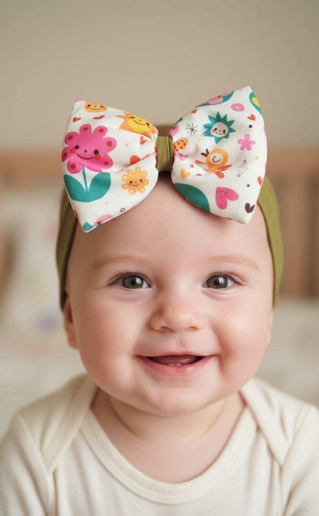 Beyaz zemin üzerine çiçek desenli, renkli fiyonk detaylı bohem tarzında çocuk saç bandı. Eğlenceli ve retro bir görünüm sağlar.