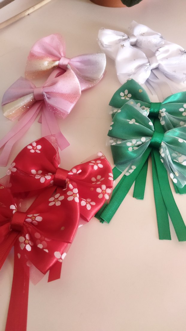Pembe, beyaz, yeşil ve kırmızı renklerde çiçek desenli fiyonk saç tokaları. Geleneksel tarzda, modaya uygun çocuk aksesuarları. çift olarak satılmakta