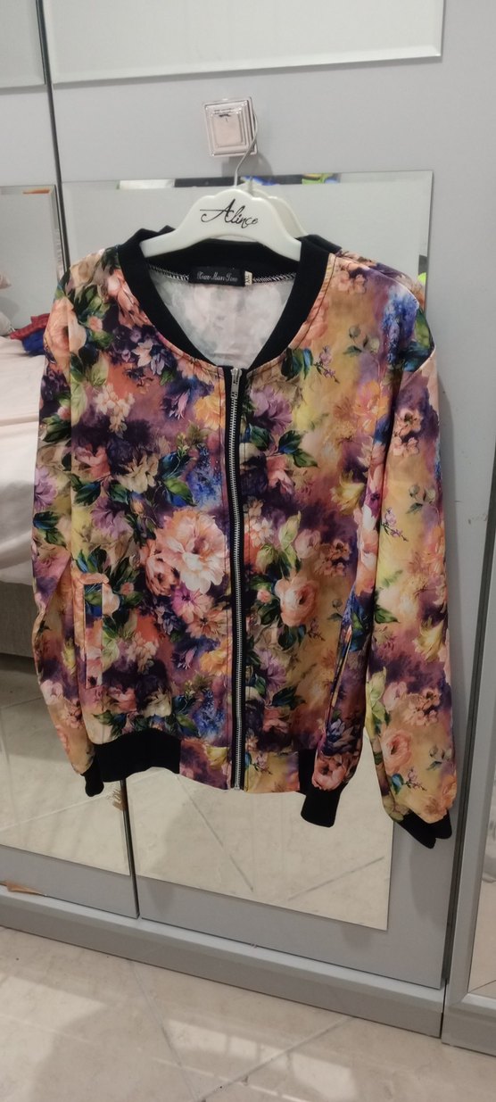Renkli çiçek desenli, fermuarlı ve uzun kollu kadın ceket. Salaş kesimli, yuvarlak yakalı ve normal midi boydadır, gündelik sokak stili için uygundur.