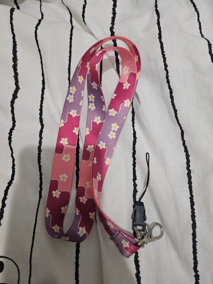 Pembe ve mor tonlarında çiçek desenli renkli kadın yaka/kart askısı. Hiç kullanılmadı