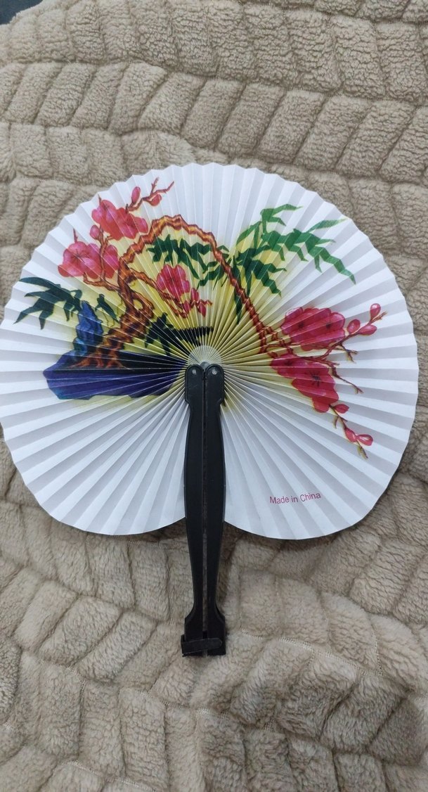 Çiçek desenli, beyaz zemin üzerinde canlı renkleriyle katlanabilir renkli yelpaze.