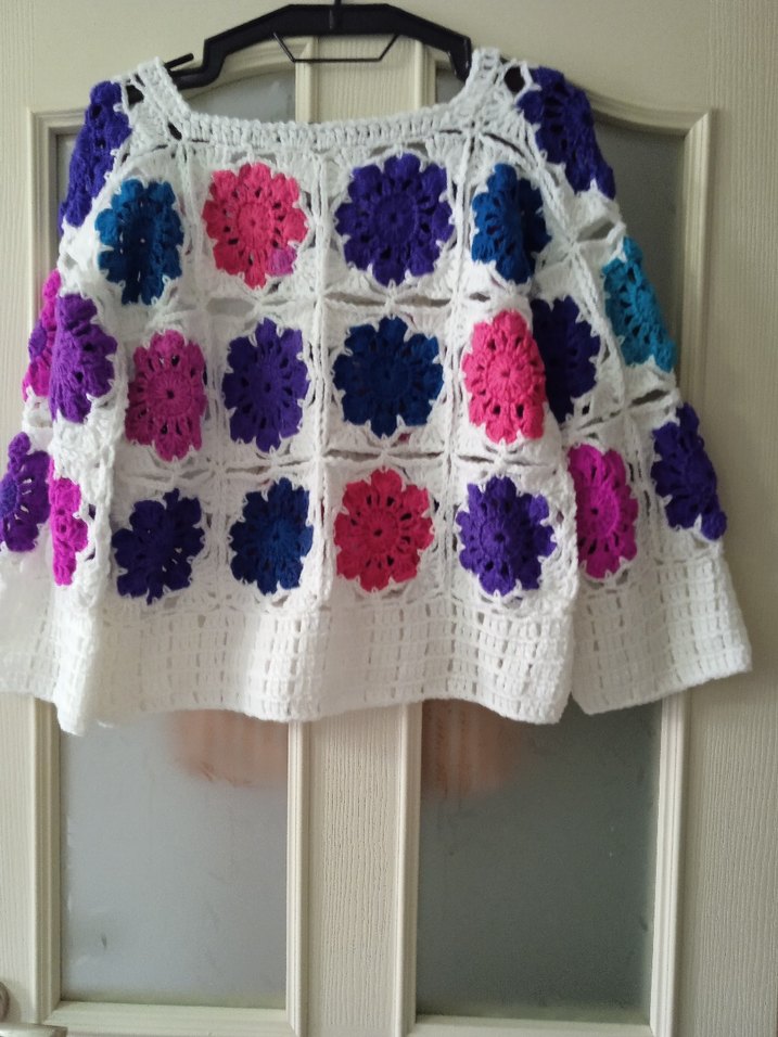 Çiçek desenli, renkli örgü kız çocuk panço, bol kesim, uzun kollu ve kayık yaka detaylıdır.