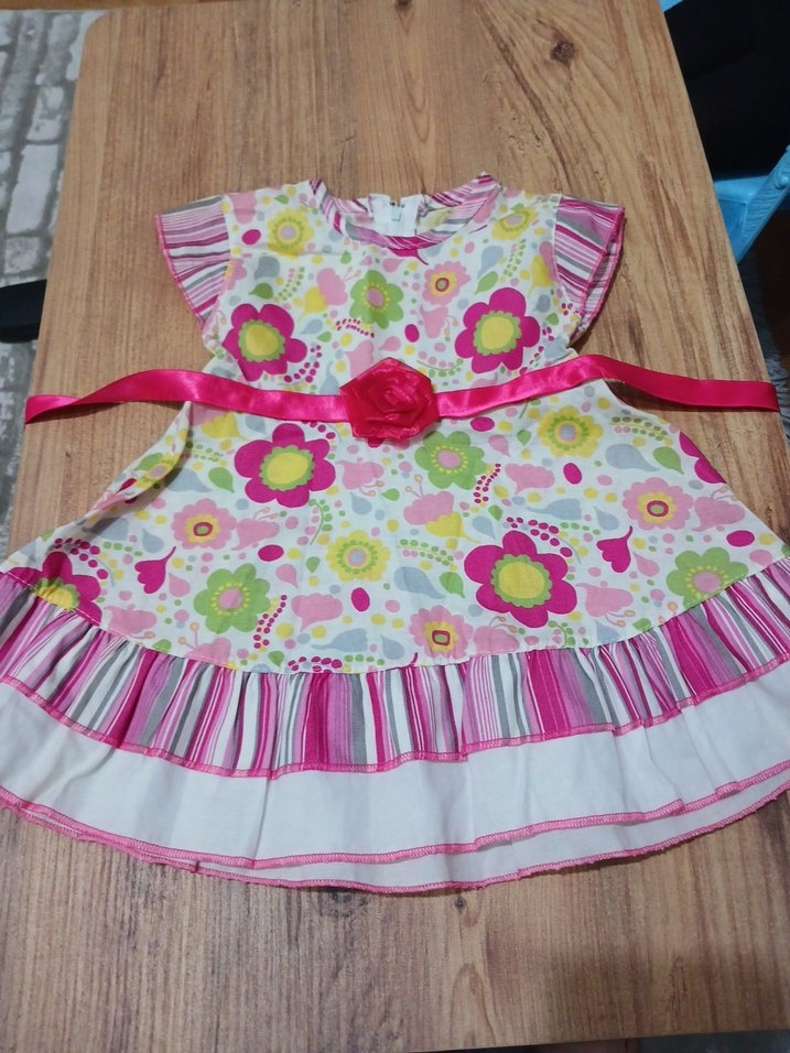 Renkli çiçek desenli, salaş kesim kız elbisesi, kayık yaka ve askılı kollu. Yumuşak sentetik kumaştan, fırfır detaylı ve bohem tarzda. 1 2 yaşa uyumlu