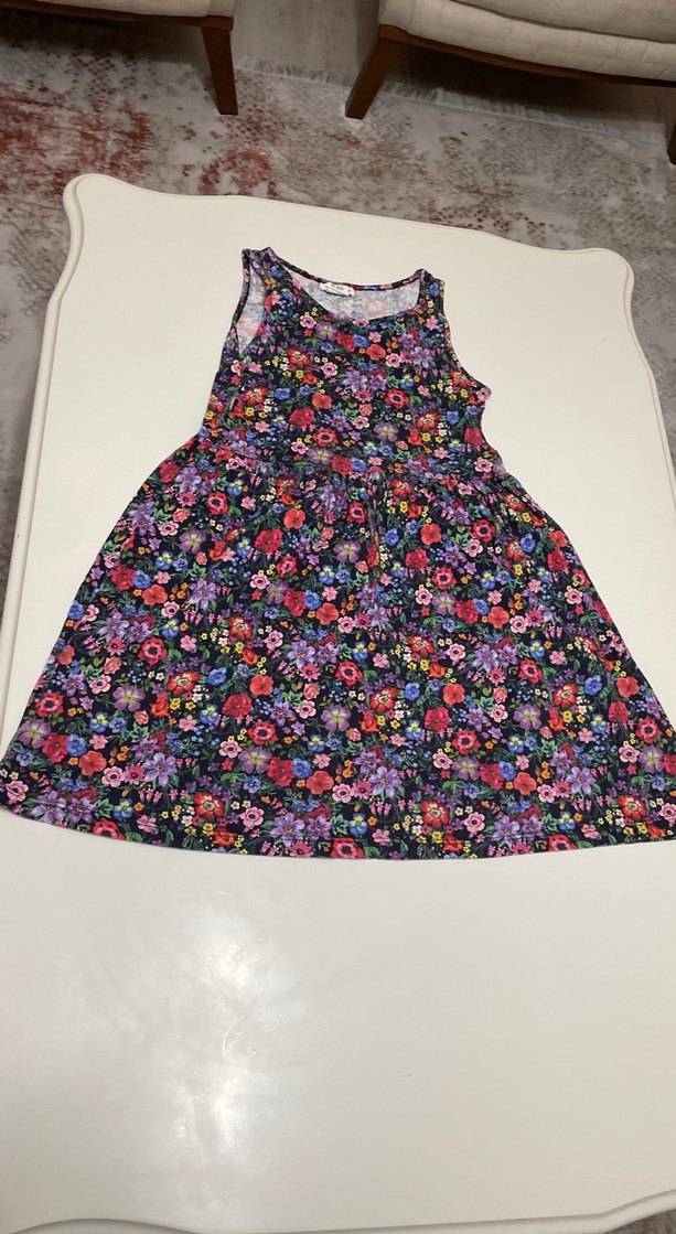 Renkli çiçek desenli, kolsuz, bol kesim kız elbisesi. Sentetik kumaştan, fırfır detaylı ve straplez yakalı bohem tarz. 7-8 yaş için uyumlu
