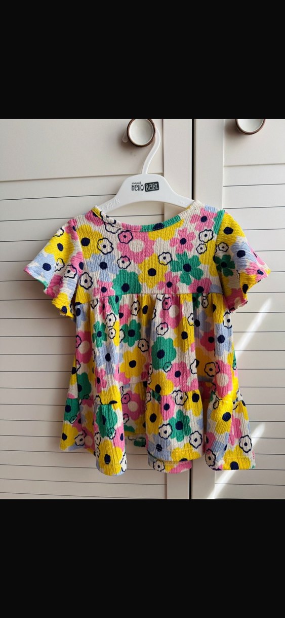 Bir kez kullanıldı. Ürün sıfır gibi tertemiz. Bedeni çok geniş. 3-6 ay yazdığınıa bakmayın benim bebeğim iri bebekti ben ona rağmen 9 aylıkken giydirdim. Renkli, çiçek desenli kız elbisesi, kısa kollu ve yuvarlak yakalıdır. Rahat kesim ve fırfır detaylarıyla bohem ve retro tarzı yansıtır.