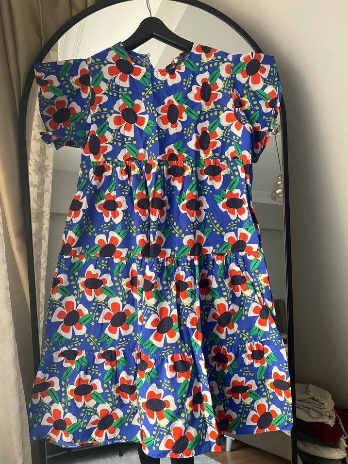 Renkli, bol kesim kız elbisesi; kısa kollu, tekne yaka ve çiçek desenli. Fırfır detaylarıyla bohem tarzda bir tasarım.