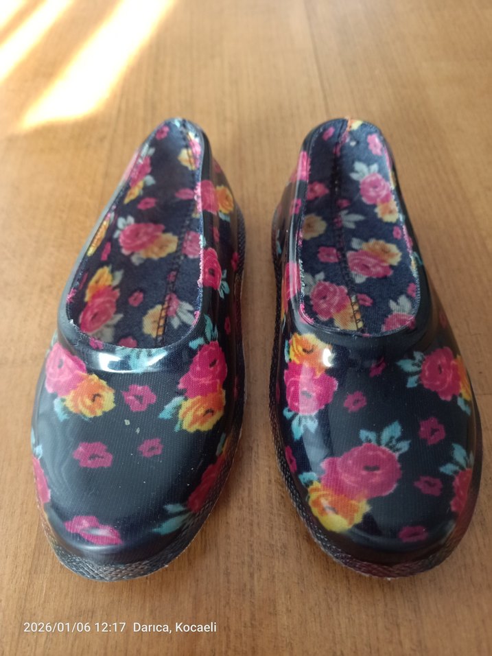 Çiçek desenli, renkli ve lastik malzemeden yapılmış kız ayakkabı bohem tarzına uygun. 19 numara