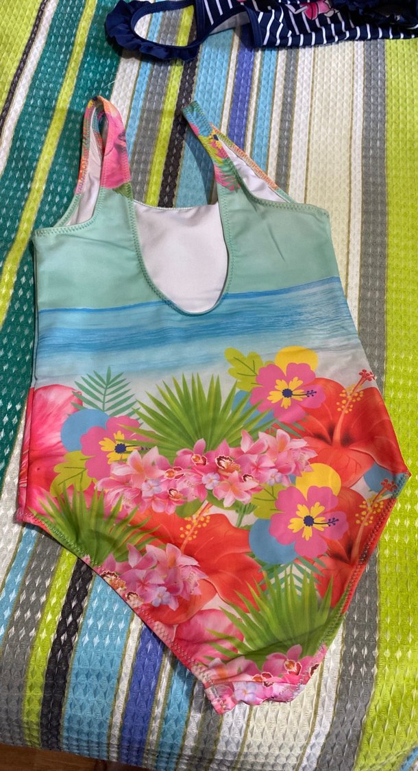 Renkli, kolsuz kız mayosu, tropikal çiçek desenleriyle plaj için uygun.