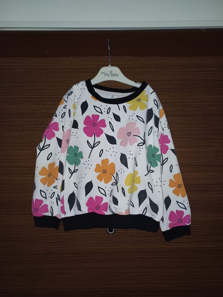Çiçek desenli, uzun kollu, yuvarlak yaka ve bol kesim kız sweatshirtü. Yumuşak sentetik kumaştan örme detaylarla sokak stiline uygun renkli tasarım.