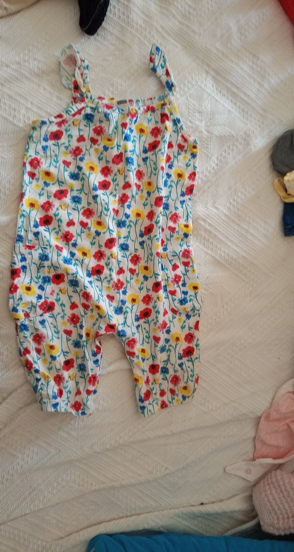 Renkli, çiçek desenli, kolsuz ve bol kesim kız tulumu, örme dokusuyla bohem tarzında.