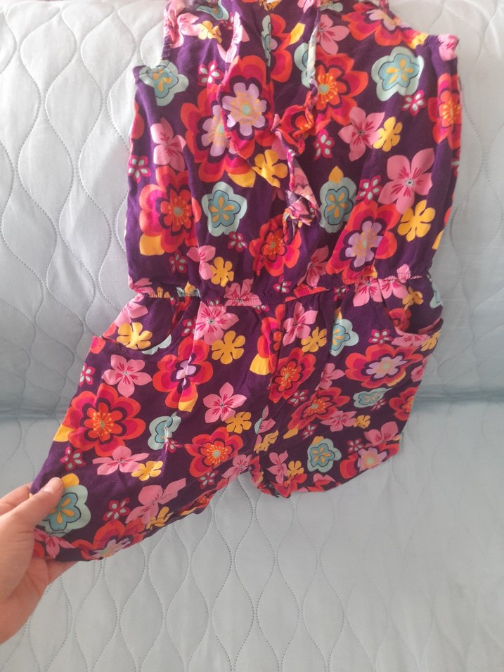 Renkli çiçek desenli, bol kesim ve kolsuz kız tulumu. Bohem tarzda, fırfır detaylı ve yumuşak sentetik kumaştan yapılmıştır.