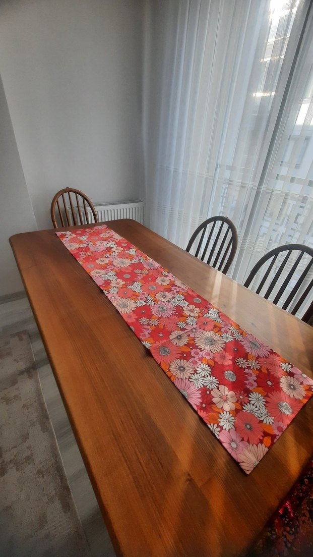 Çiçek desenli, renkli tie-dye desenli masa örtüsü, masanıza canlılık katıyor.