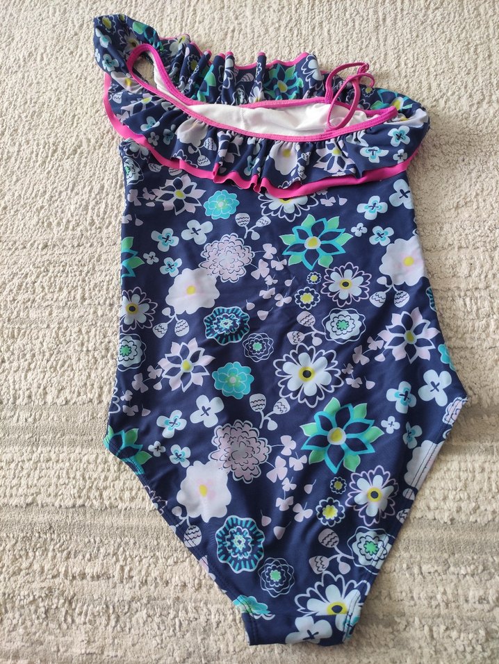 Renkli çiçek desenli mayo tek askılı ve fırfırlı detaylara sahip, plaj için uygun.