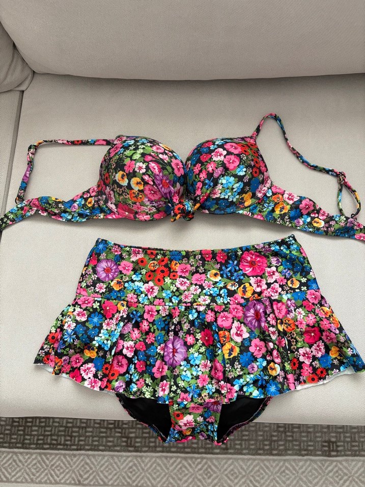 Çiçek desenli, renkli, askılı üst ve fırfırlı mini etekli, vücuda oturan bikini takımıdır. Plaj için uygundur.