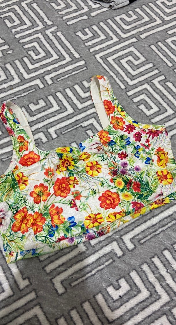 Kısa uzunlukta, renkli ve canlı çiçek desenli bohem tarzda bir mini büstiyerdir.