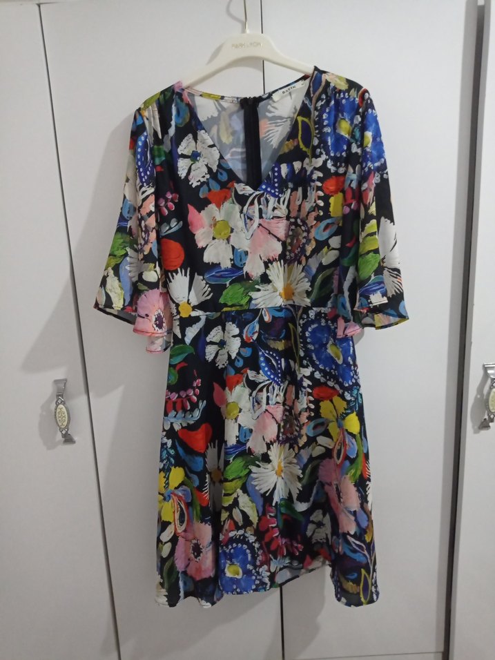 Çiçek desenli, renkli mini elbise. V yaka, kısa kollu ve fırfır detaylıdır. Rahat kesimiyle bohem tarzı için uygundur.