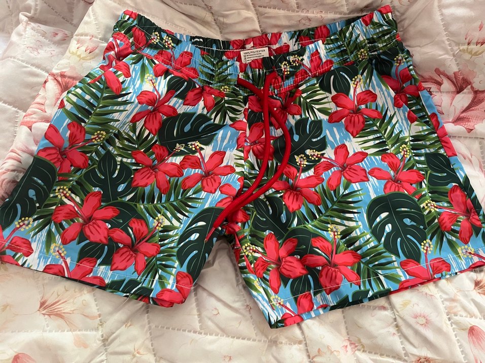 Canlı çiçek desenli, bağcıklı bel detaylı, vücuda oturan mini deniz şortu .Bohem tarzıyla plajda kullanıma uygun. Hiç giyilmedi