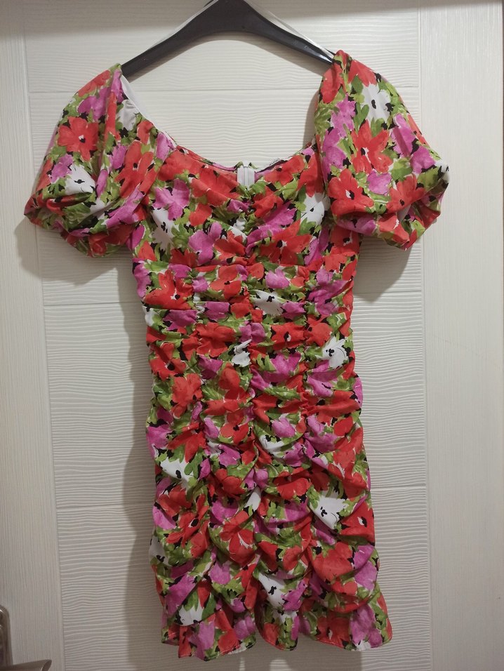Pembe renkli çiçek desenli, kısa kollu ve V yakalı, büzgülü mini elbise. Bohem tarzıyla öne çıkar.