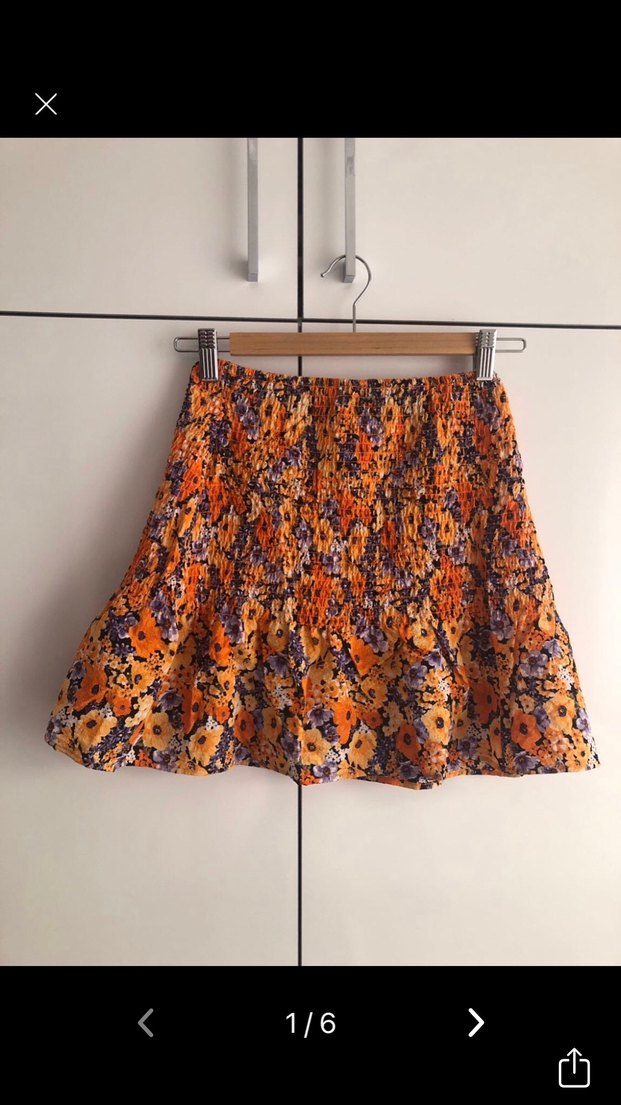 Sentetik kumaştan, bol kesim, fırfırlı ve koyu renkli çoklu çiçek desenli mini etek. Çok az giyildi yeni gibi durur. Üst bölümü gipeli lastikli model XXS beden 12-13 yaşa uygundur