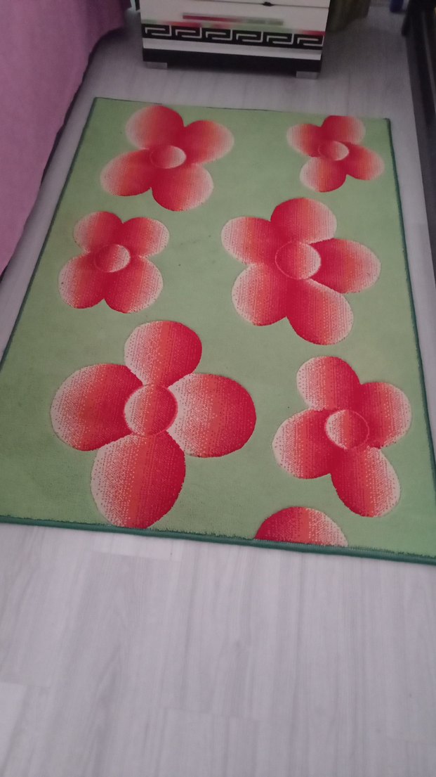 Canlı renklerde çiçek desenli, modern tarzda, yumuşak dokulu halı. 1mc eni uzunluk 1,4 cm vereceğim fiat iki adeti kapsıyor herhangi kusuru yok tertemiz