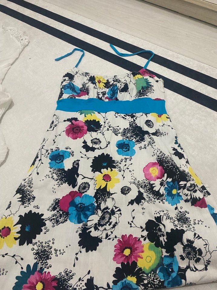 Renkli çiçek desenli, mavi bağcık detaylı ve rahat kesimli mutfak önlüğü. Mutfakta canlı bir hava katar.