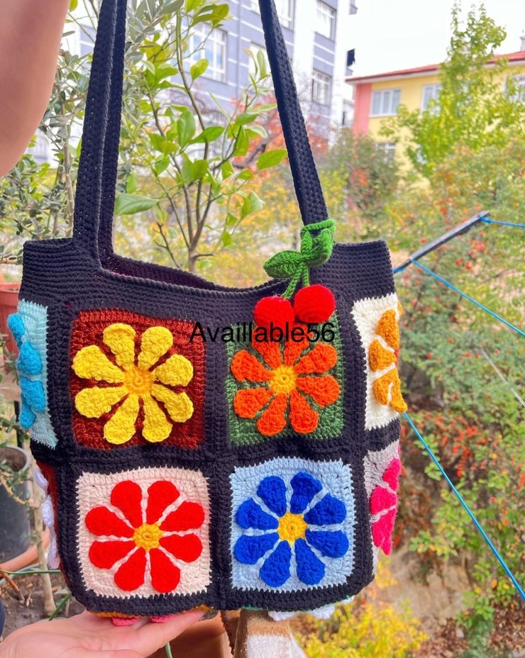 Renkli karelerde çiçek desenleri bulunan, yumuşak örgü kumaştan yapılmış bohem tarzda örgü çanta. Üzerinde yeşil yaprak detayı vardır.