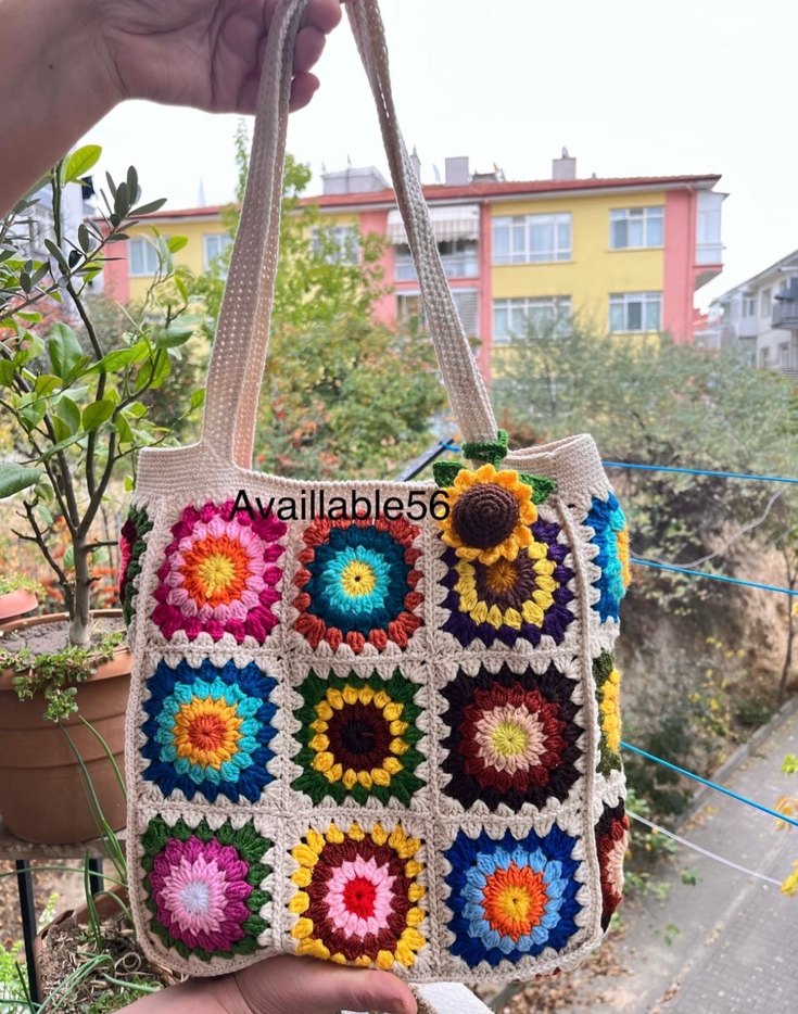 Renkli, çiçek desenli örgü bohem kadın çantasıdır. Örgü sapları ve geniş yapısıyla günlük kullanıma uygundur.