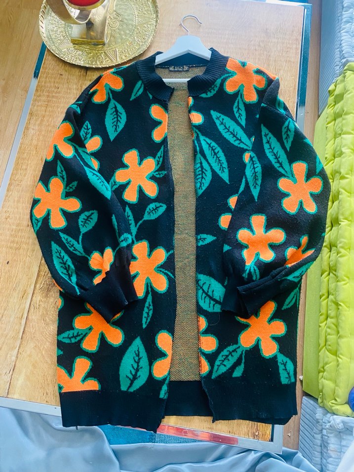 Renkli çiçek desenli, örgü dokuma, bol kesim uzun kollu kadın hırka. Normal uzunlukta, notched lapel yaka ile günlük sokak stiline uygun.