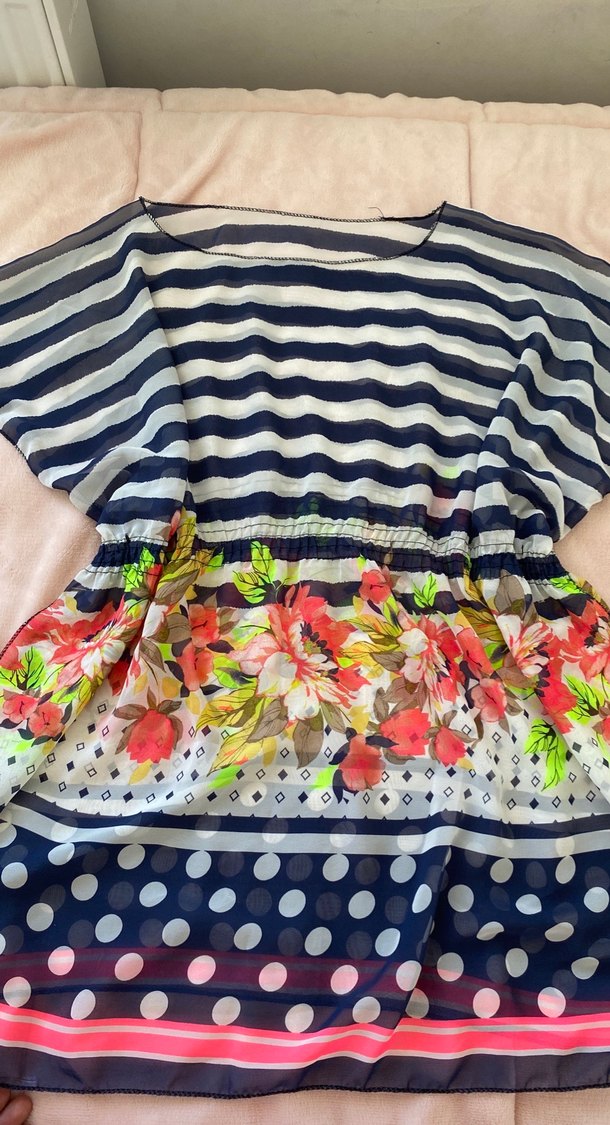 Renkli desenlere ve volan detayına sahip, bol kesim, kısa kollu pareo