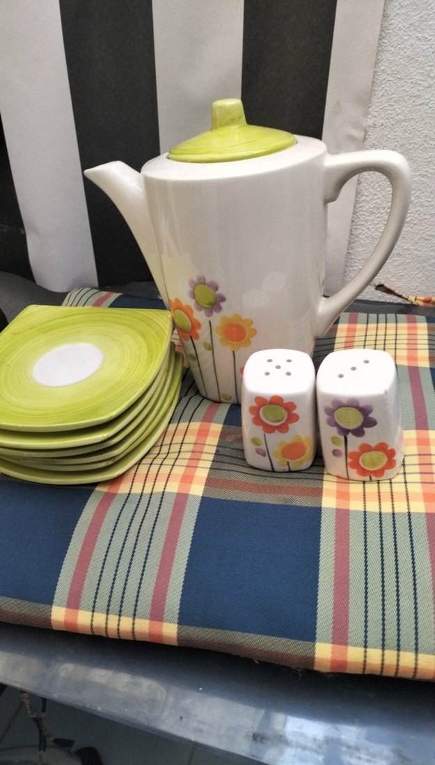 Beyaz demlik, yeşil kapaklı, yeşil tabaklar ve çiçek desenli tuzluk-biberlik içeren renkli porselen çay seti.