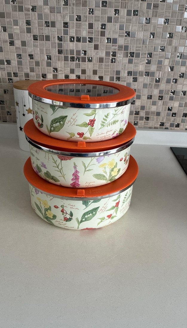 Çiçek desenli, turuncu kapaklı renkli saklama kapları seti, farklı yiyecekleri saklamak için uygundur.