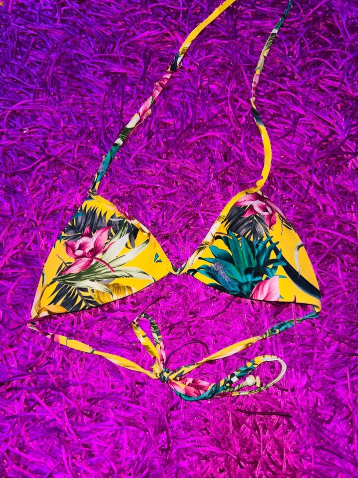 Renkli tropikal çiçek desenli, strappy bağlamalı ve fırfır detaylı, plaj için uygun oturan bikini üstü.