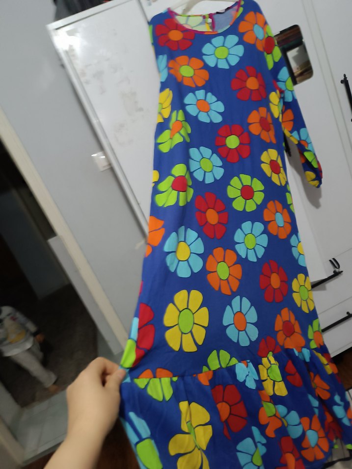 Renkli çiçek desenli, uzun kollu, bol kesim, yuvarlak yaka ve fırfırlı detaylı uzun elbise. Yumuşak sentetik kumaştan üretilmiştir.