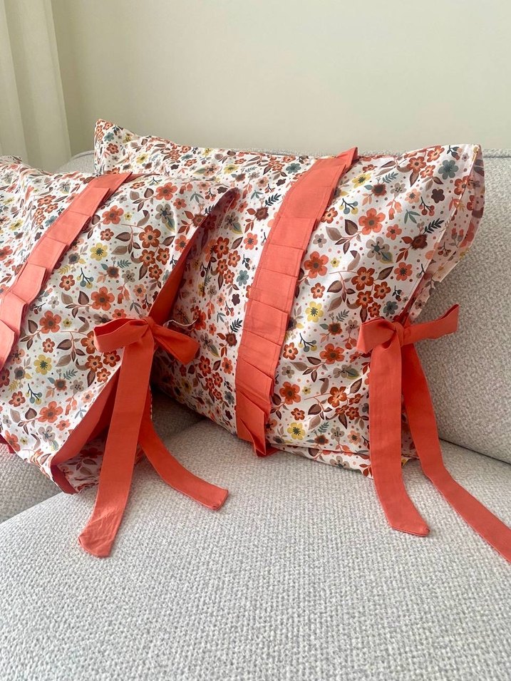 Renkli çiçek desenleri, fırfır detayları ve bağlamalı kurdeleleriyle şık yastık kılıfları