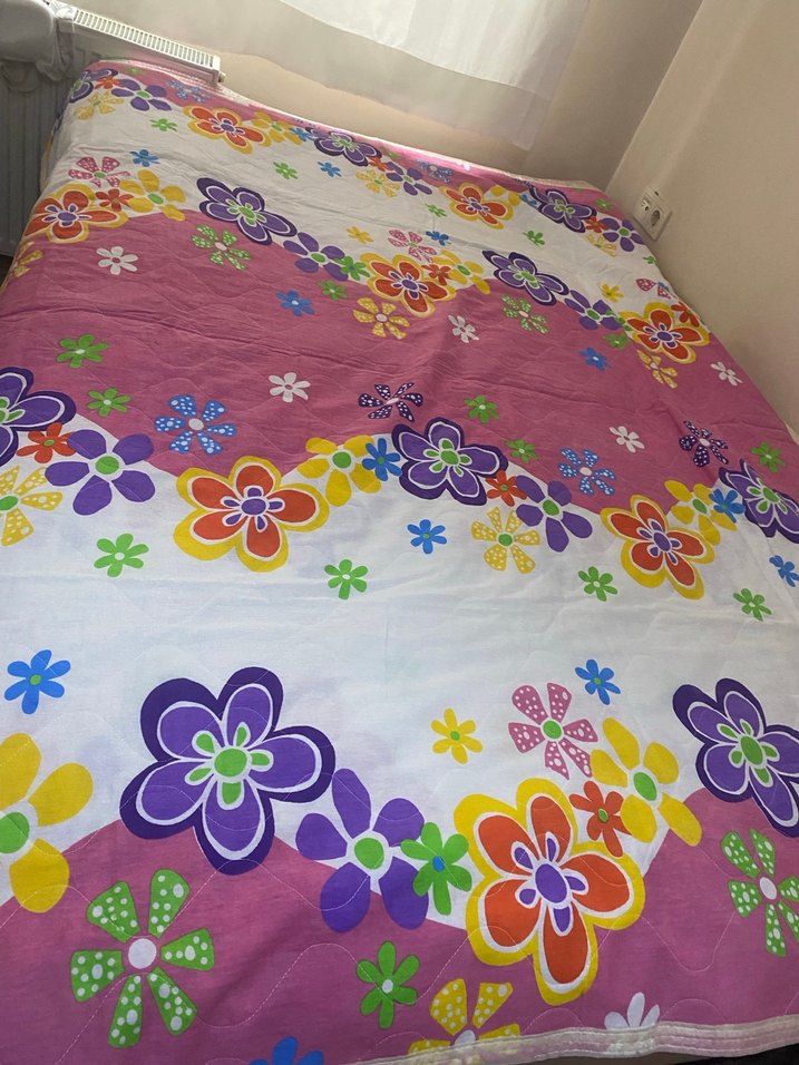 Bu renkli yatak örtüsü, pembe ve beyaz zemin üzerinde çeşitli parlak çiçek desenlerine sahiptir. İki taraflı kullanılabilir