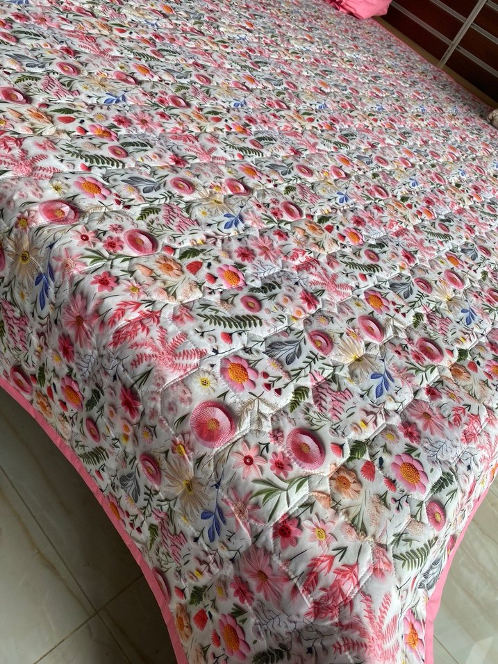 Çok renkli çiçek desenine sahip, kapitone işlemeli yatak örtüsü, yatak odasına canlılık katar.